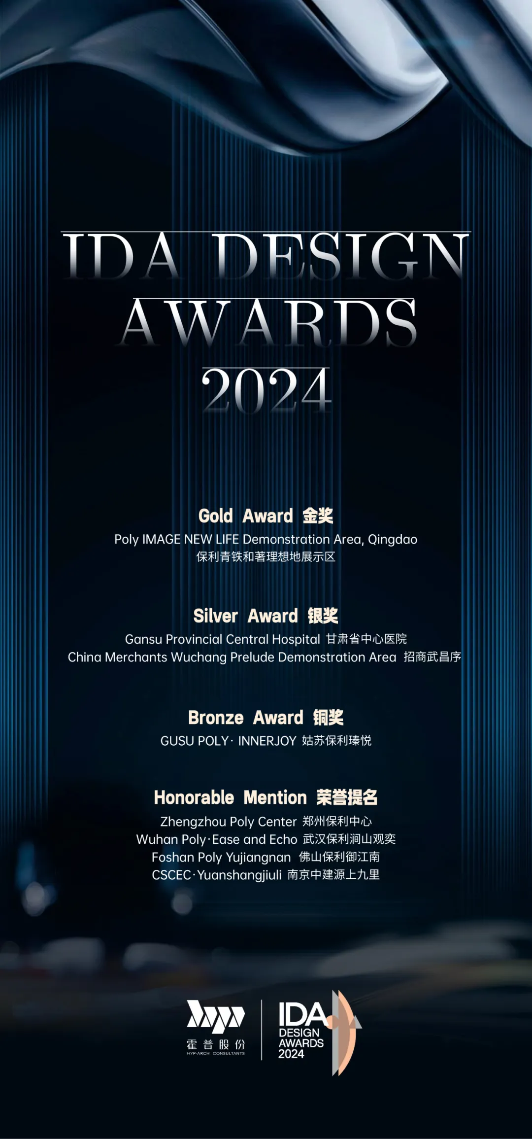 近日,在备受瞩目的美国 IDA 国际设计大奖中,霍普股份的作品大放异彩。其中,保利青铁和著理想地展示区项目荣获可持续商业建筑类别金奖,充分展现了公司在可持续建筑设计领域的实力与创意。甘肃省中心医院和招商武昌序项目双双获得银奖,保利姑苏瑧悦项目则将铜奖收入囊中,此外,还有四个项目获得了荣誉提名,包括一个室内设计项目,彰显了公司在不同类型项目设计上的杰出表现。