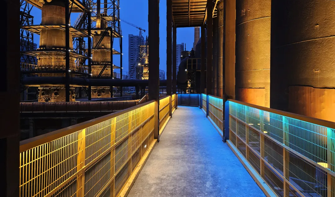 夜幕降临,邹城铁合金厂的遗址在金色灯光的映衬下焕发出别样的魅力。这金色的光辉,呼应了“铁合金”中的“金”字,象征着工业遗产与现代城市活力的交织,带来了层次丰富的光影效果,使整个园区在夜晚更加迷人。