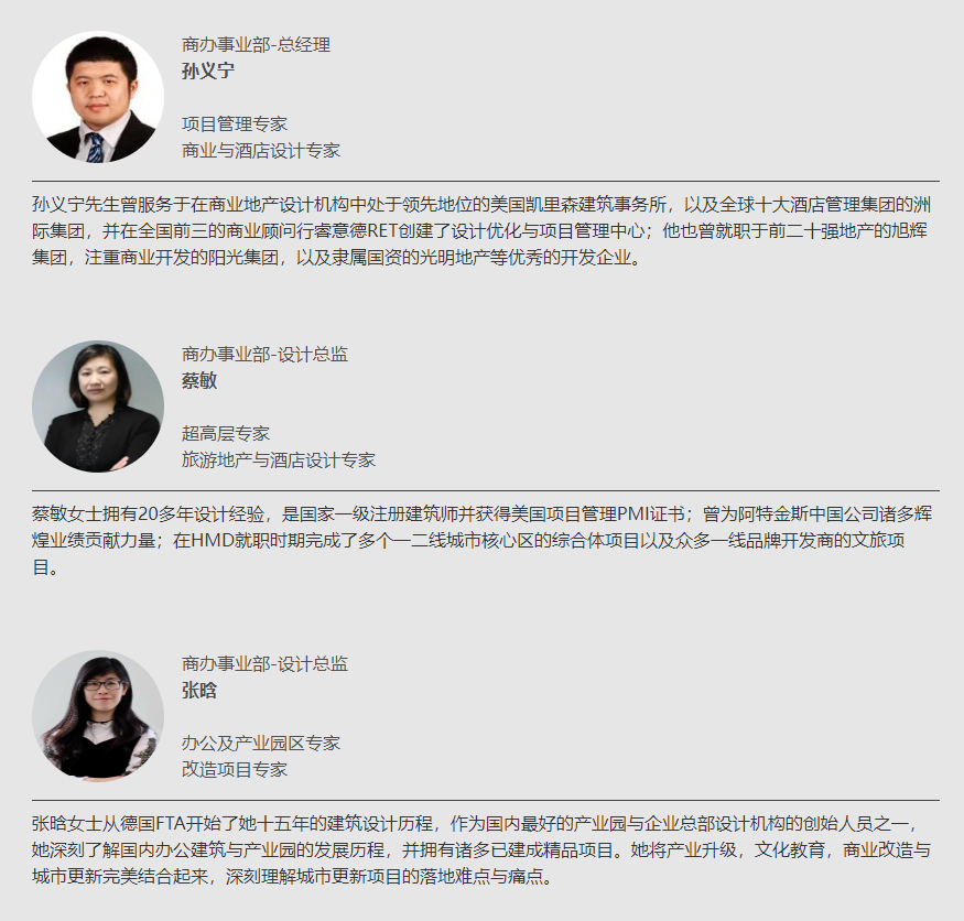 商办事业部还有拥有强大的支持与顾问团队,如两院院士团队、艺术设计大师Alain Bony团队、W+工作室、SCSY等,这使得团队创造的价值能充分体现在“投 、融、管、退”各个阶段。