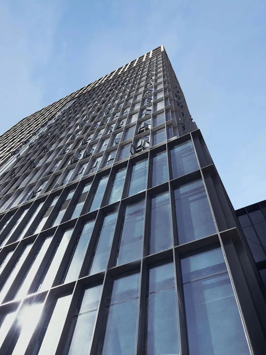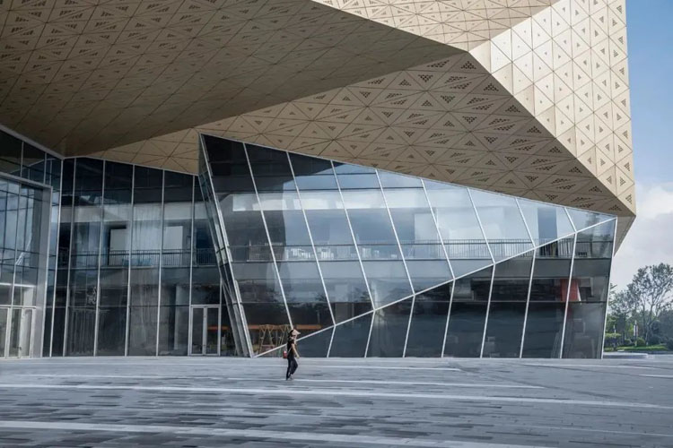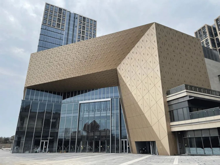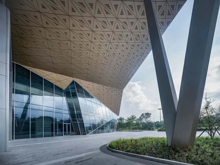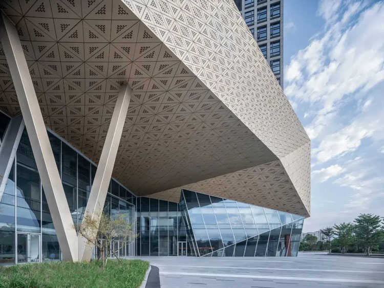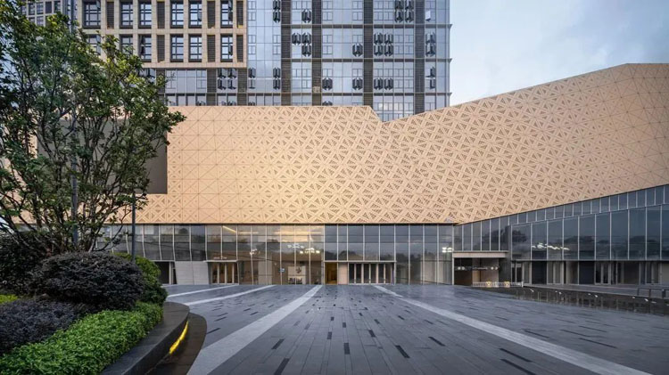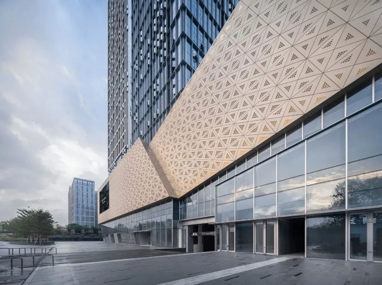 采用冲孔纹理模仿水纹的柔,形成有刚有柔的建筑语言。通过两次参数化设计,打造独特的肌理模板,将水纹的柔美赋予建筑之上。