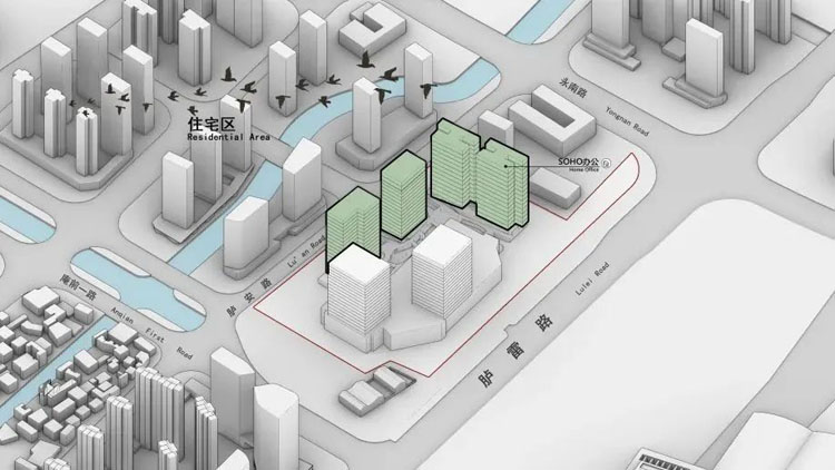 地块西南角四栋SOHO办公楼。西侧为河流贯穿,景观较优,同时远离城市主干道人群嘈杂的区域,闹中取静,更能满足工作生活需求。