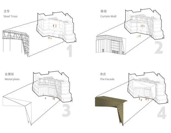 通过BIM化的龙骨、幕墙、金属板、表皮的层层搭建,最终达到精准参数化的效果。