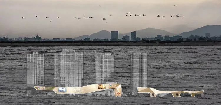 建筑造型的设计理念便取自这“三山一水”,三山刚毅、挺拔,闽江之水柔和、流动。利用柔和刚的碰撞,冲击视觉感性。