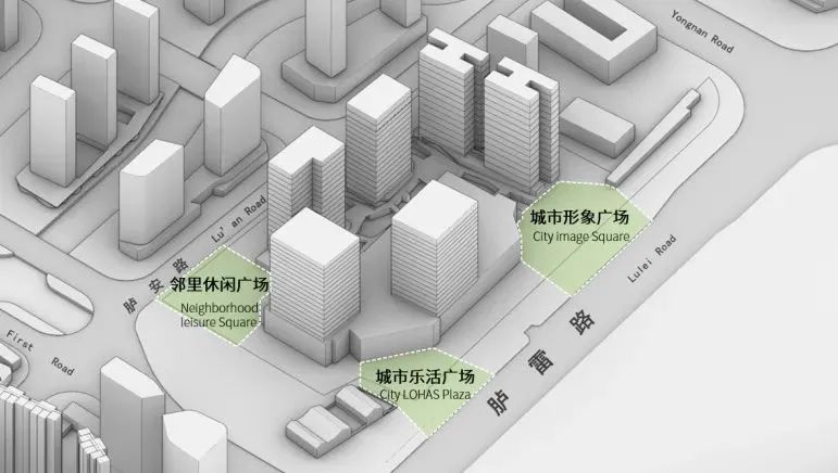 外部设置三大广场:城市形象广场、城市乐活广场、邻里休闲广场。为市民休闲、商业展示、人流组织和缓冲提供空间,同时将成为市民休闲,商业活动,艺术展示的城市会客空间。