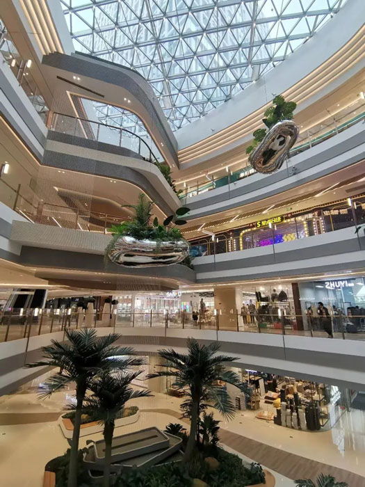 MALL沿城市主干道站前路与阳光路布置,内部采用流线环形动线与通层阳光中庭组合的空间形式,并在屋顶层设置了室外空中花园。