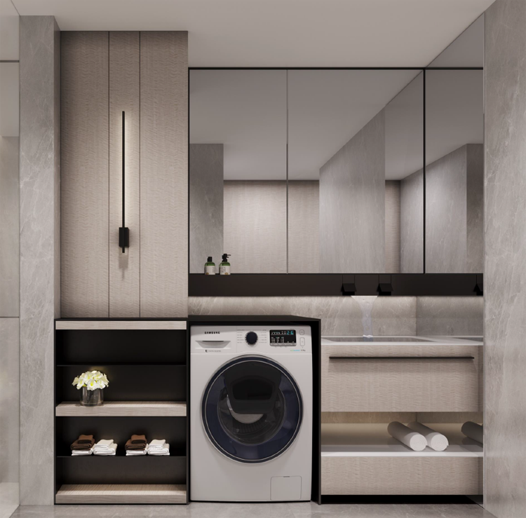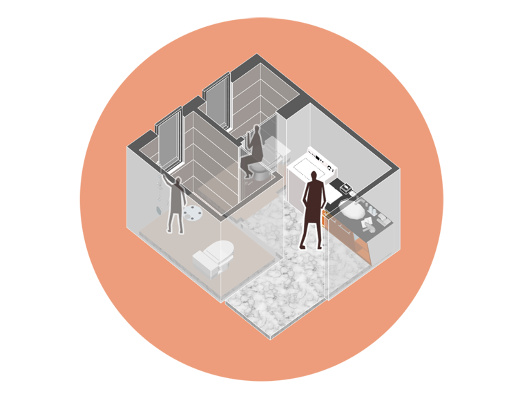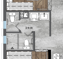 1.5卫也绝不是在原有空间上单单加个马桶这么简单,它更考验设计师对空间划分的概念和对使用习惯的认知,既要使0.5卫的用处完美发挥出来,又要保证空间的隐私。为此我们也对这部分空间的设计进行了一轮又一轮的调整深化,最终才定下了这种布局模式。