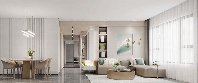 将客厅、餐厅、厨房布置在一条完整的南北线上,汇聚一家人日常生活的所有生动画面。南北贯通的设计使整个空间的通风采光达到最优,视野上贯通也放大了空间的尺度感,视线的交互、流线的可达,记录着一家人点点滴滴的温馨回忆。