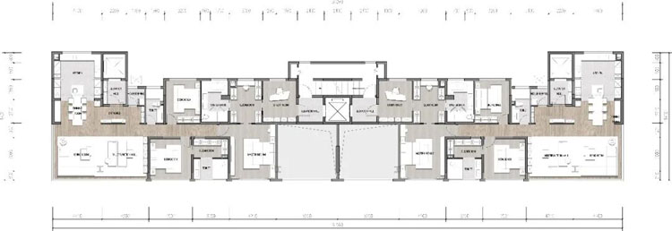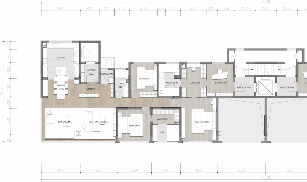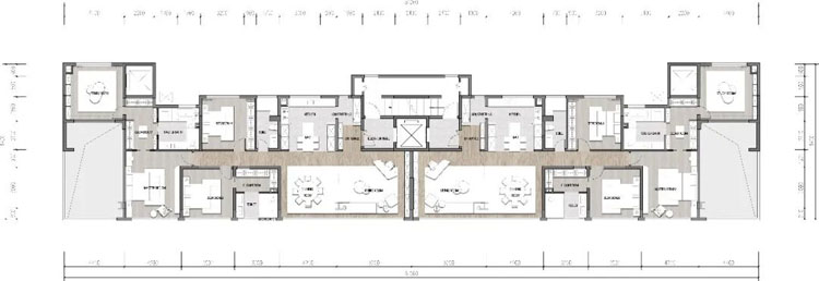 在最终呈现的方案中走道空间被压缩至最小值,如此大面宽下,走道尚且才一个套房的面宽。