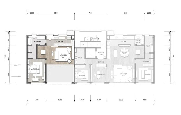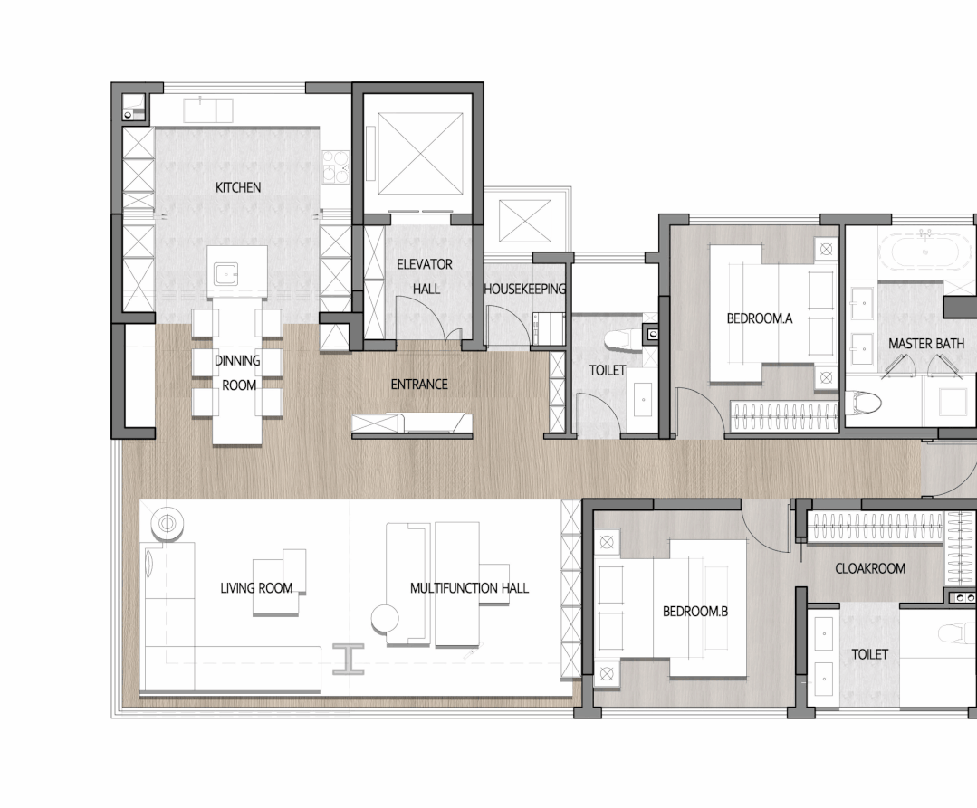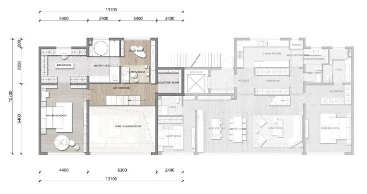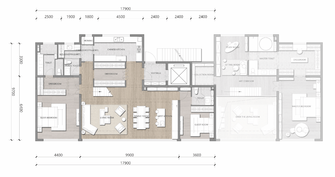 所有户型采用公区LDK一体化设计,客厅-餐厅-西厨-中厨连续摆放在轴线上,打开空间,以此构成家庭动区的核心空间。