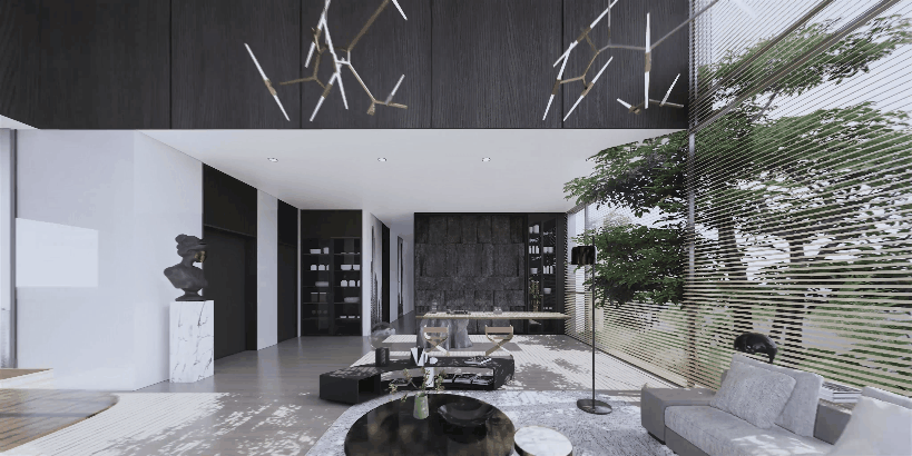 公建化玻璃幕墙配以奢阔挑空横厅,光影交互,给予住户极致的通透感。