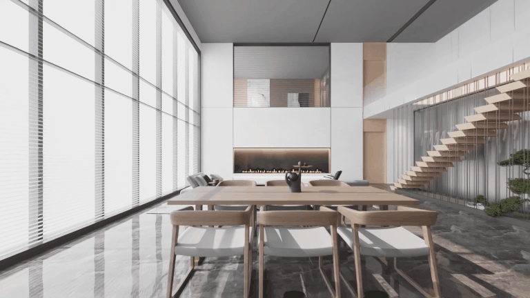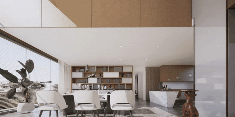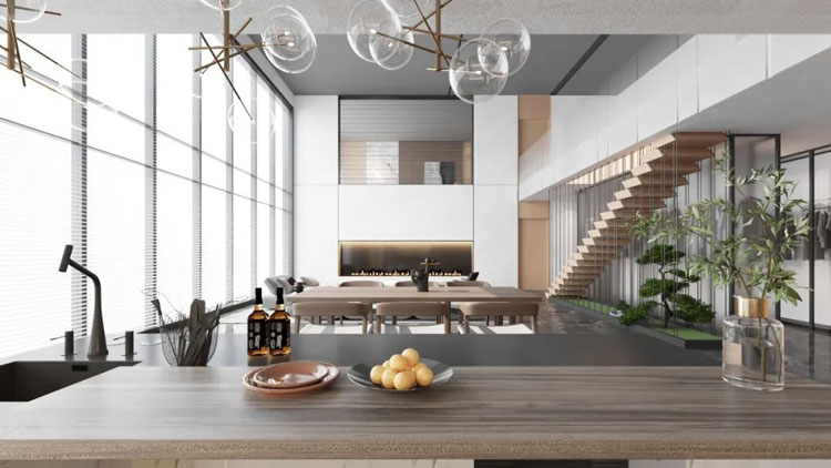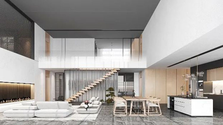 一层净9.7m*5.2m的大横厅让客、餐、西厨能够一体化全南设计,6m挑高放大空间立体感,楼梯也与挑空结合成为了装饰家中的“艺术品”。