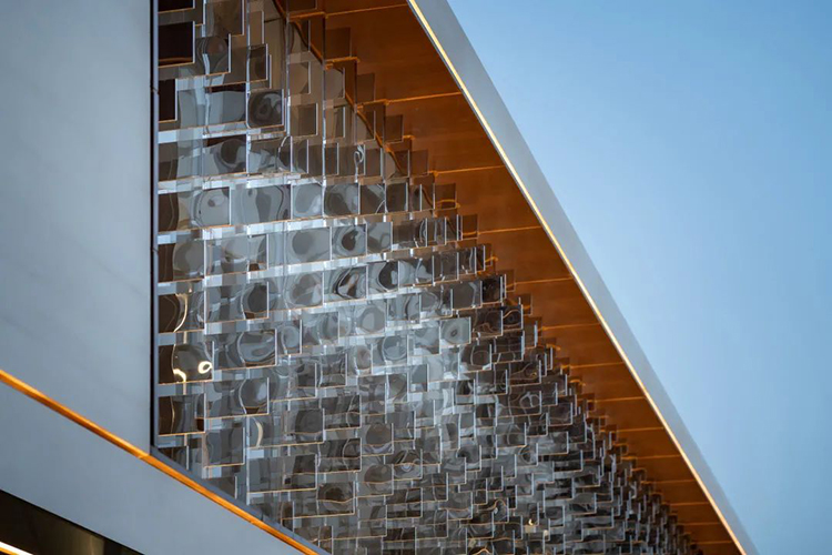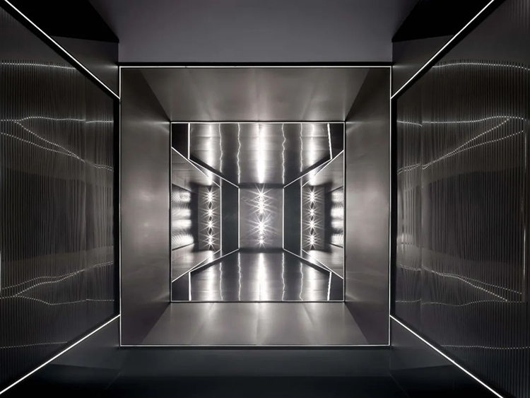 极简的设计线条中包含了极繁的细节,在光环境下,无数面利用参数化设计手法排列的镜面不锈钢片相互反射,形成无限梦幻的意境。