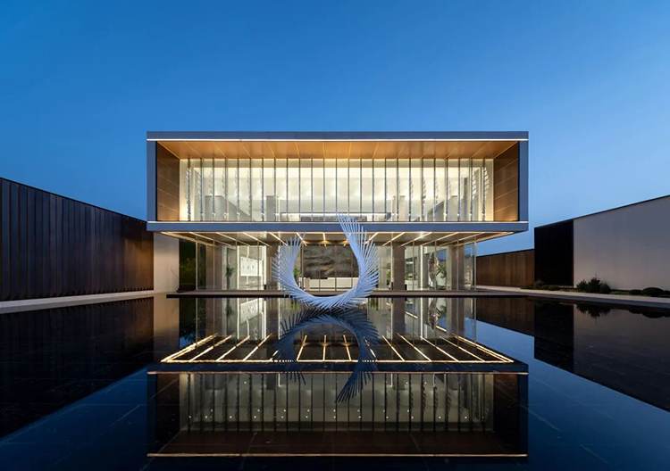 项目整体设计围绕“云上”展开,采用“反重力设计”来打造建筑的漂浮感,厚重的石材与通透玻璃的体块对比,气势磅礴。