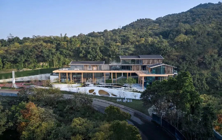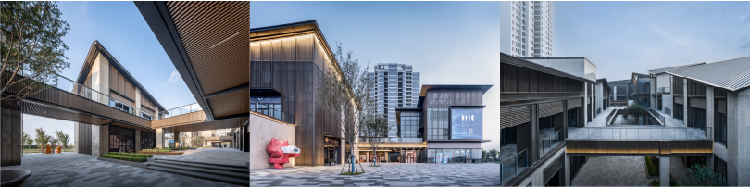 项目由8座2-3层小建筑组成,空间布局合理,错落有致,曲折流畅。现代中式的建筑风格,源自于对传统文化内涵的追求。立面设计中融入了宋代美学韵味,通过竖向格栅的层级划分和疏密变化,打造富有节奏与层次感立面。屋顶采用对角双坡形式,形成独特的第五立面,整体呈现出错落有致、起伏连绵的“云山”意境。
