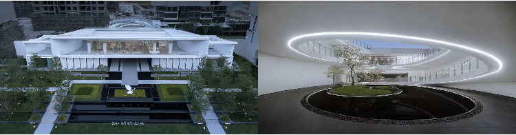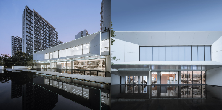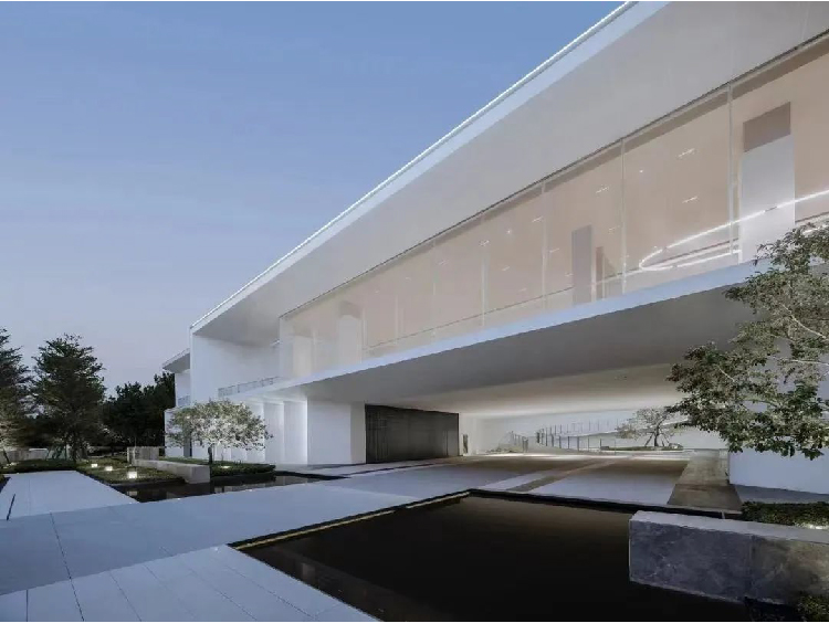 方案以“极简、光影、体验”为原则,采用横向舒展的体块、白色基调,附之水景映衬,幕墙结合,使建筑犹如一方白色玉石,矗立于荔湖河畔。简约纯粹的设计语言,充满韵律的折板节奏,赋予建筑形体的生命力与艺术感,令充满学术气息的氛围与空灵的诗性自然相合相生,引起文化与艺术之间的共鸣。