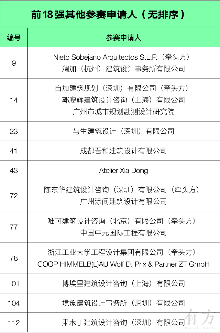资格预审会上,同时经记名投票产生了前18强的其他参赛申请人(无排序)。附名单如下: