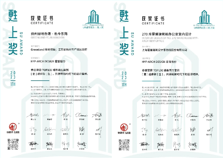 近日,首届SU AWARD甦上奖获奖名单正式对外公布。霍普股份参赛作品「扬州绿地香港·也今东南」获UR城市再生/建筑设计-销售展示中心类大奖、「270库霍普建筑办公室室内设计」获旧改/室内设计-办公类大奖。「更」选伴新「生」,共铸崭新时代下的设计精神。第一批城市再生TOP100经典案例包含中国、美国、意大利、新加坡、法国、德国、西班牙等国内外优秀再生/改造项目。