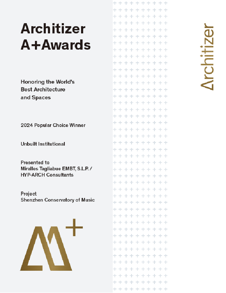 近日,知名建筑媒体Architizer公布了第12届A+Awards最终大奖的获奖者名单,霍普股份和EMBT联合申报的「深圳音乐学院」获得未建成的机构类项目类别大众评选奖(Popular Choice Winner)。