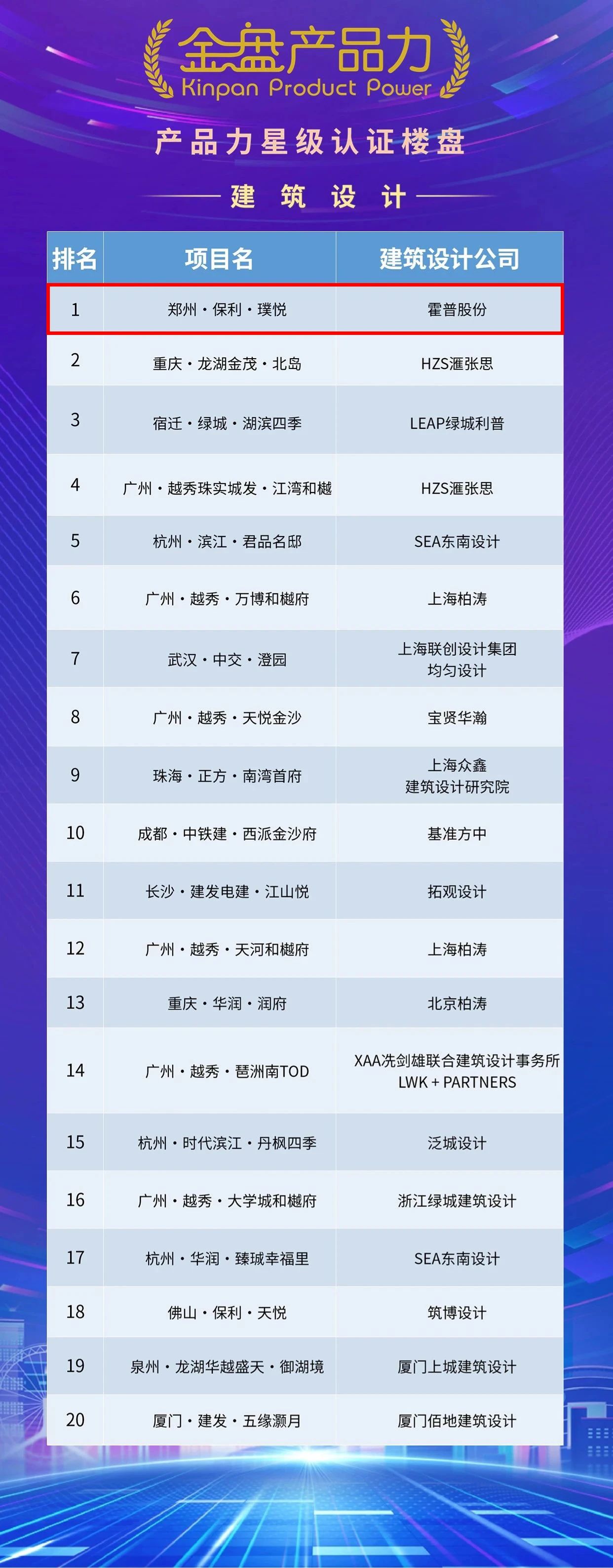 颁奖典礼上揭晓了金盘产品力星级认证楼盘高端豪宅、奢享大宅、优享美宅、品质美宅、建筑设计、景观设计、室内设计等20强榜单,由霍普股份设计的郑州保利·璞悦荣登建筑设计榜首。