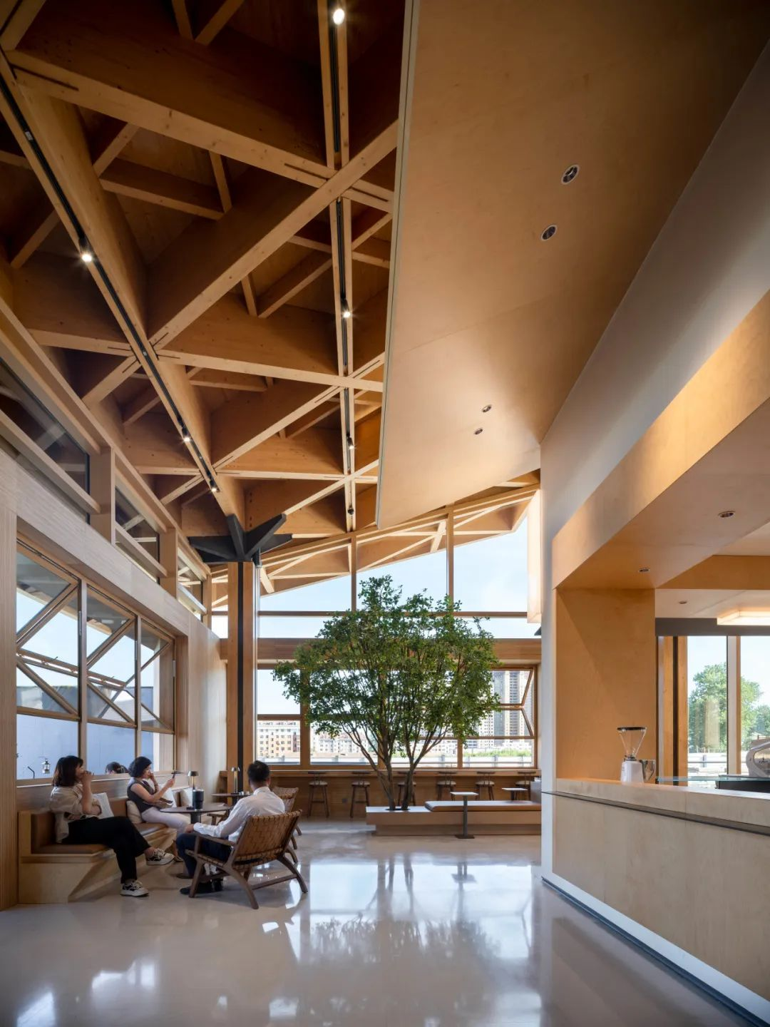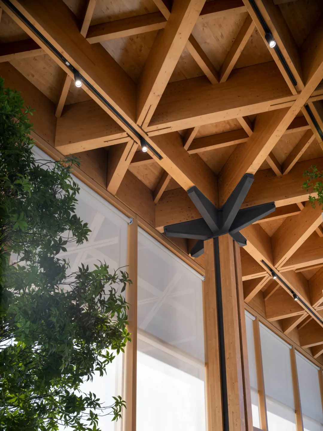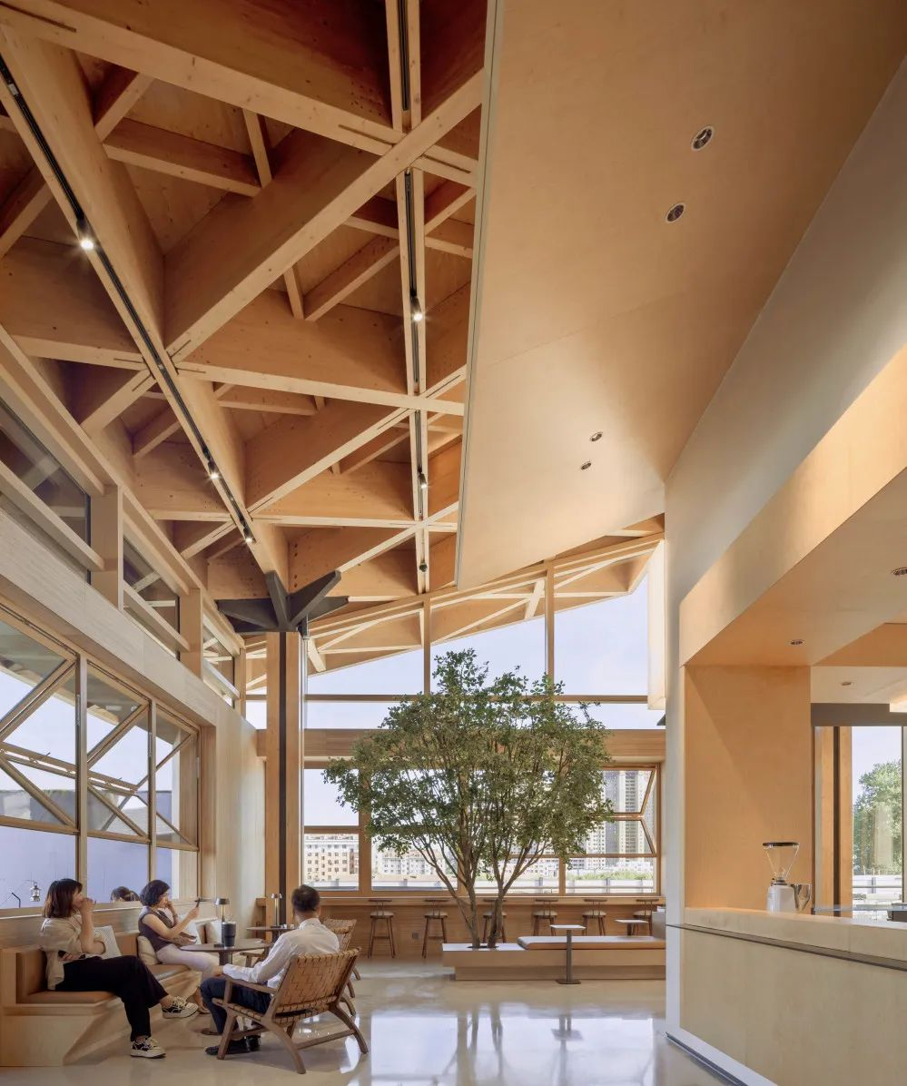 木构给人以温暖感受,纯粹的玻璃幕墙与云杉木的暖色木构,搭配局部的木构橱窗,整座建筑从空间到形式,既蕴含了传统建筑的神韵,又兼备了现代建筑的精神。