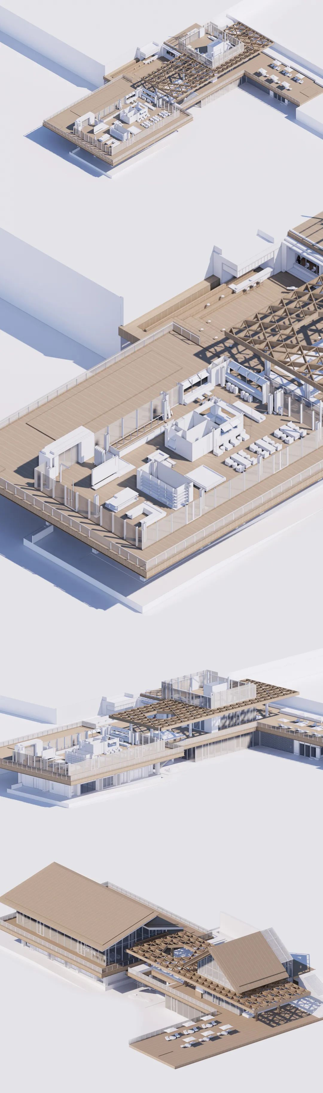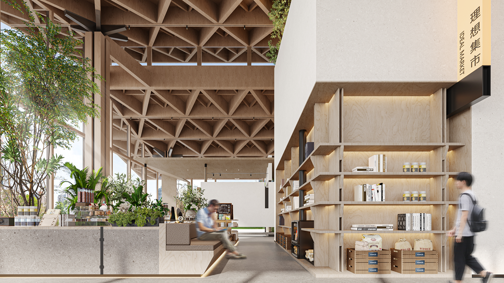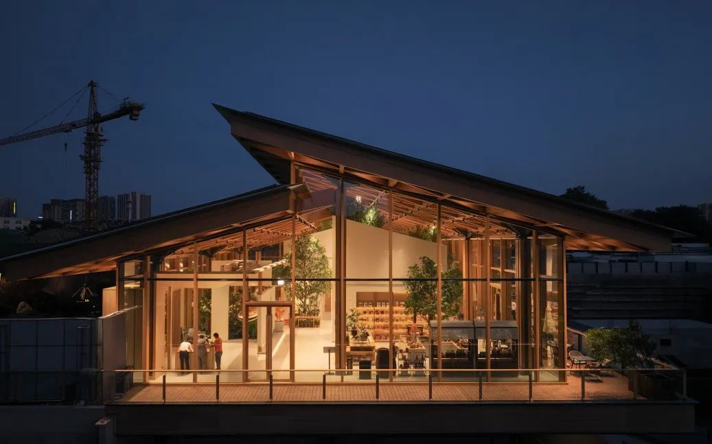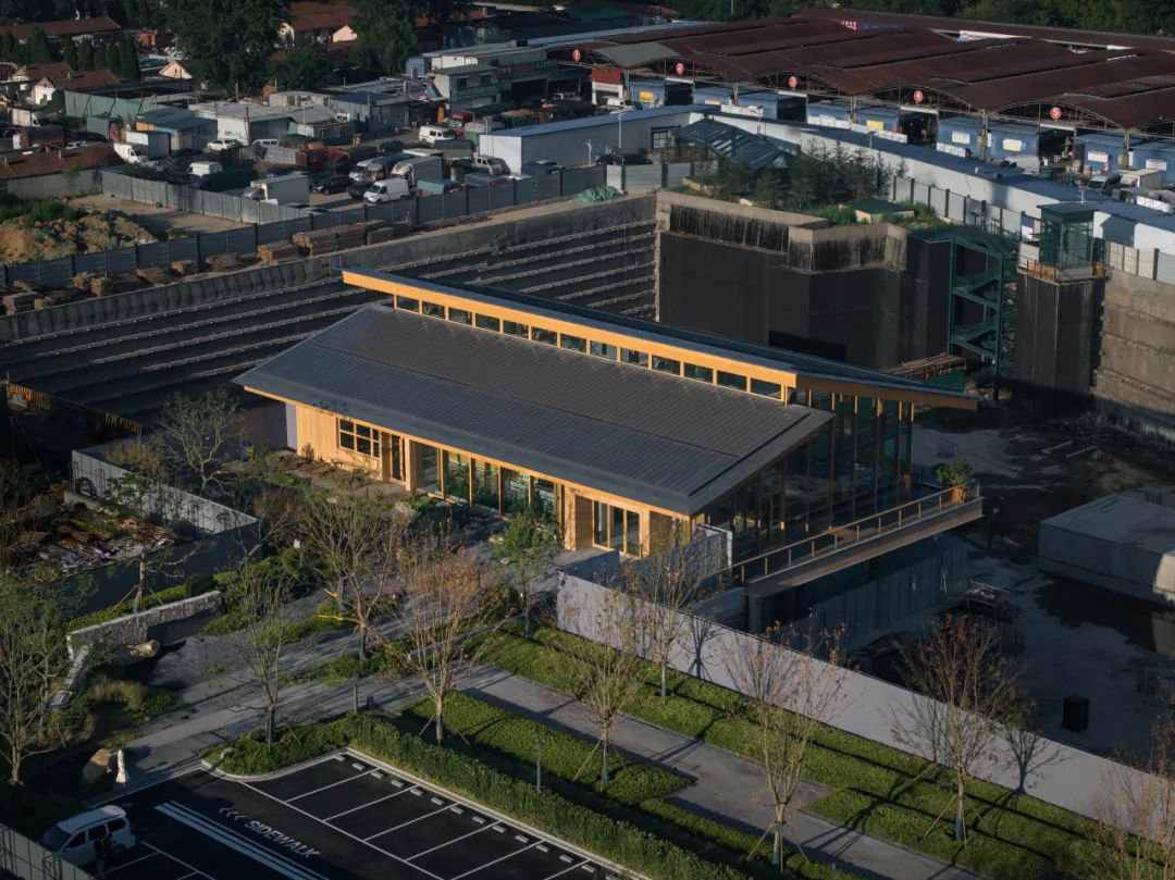 示范区总体上由两部分组成:售楼处(未来为商业)和归家大堂,两部分功能通过木构架统一,并且以不同层面的标高平台进行串联。