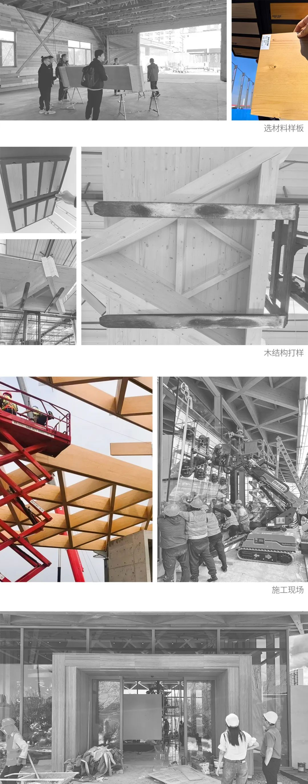 本次项目建筑师倾注心血,频繁赴工厂进行材料选择与木结构的打样。并多次前往青岛工地现场,细致检查施工进展,与甲方和施工团队紧密沟通,确保建筑完美呈现,实现预期落地效果。