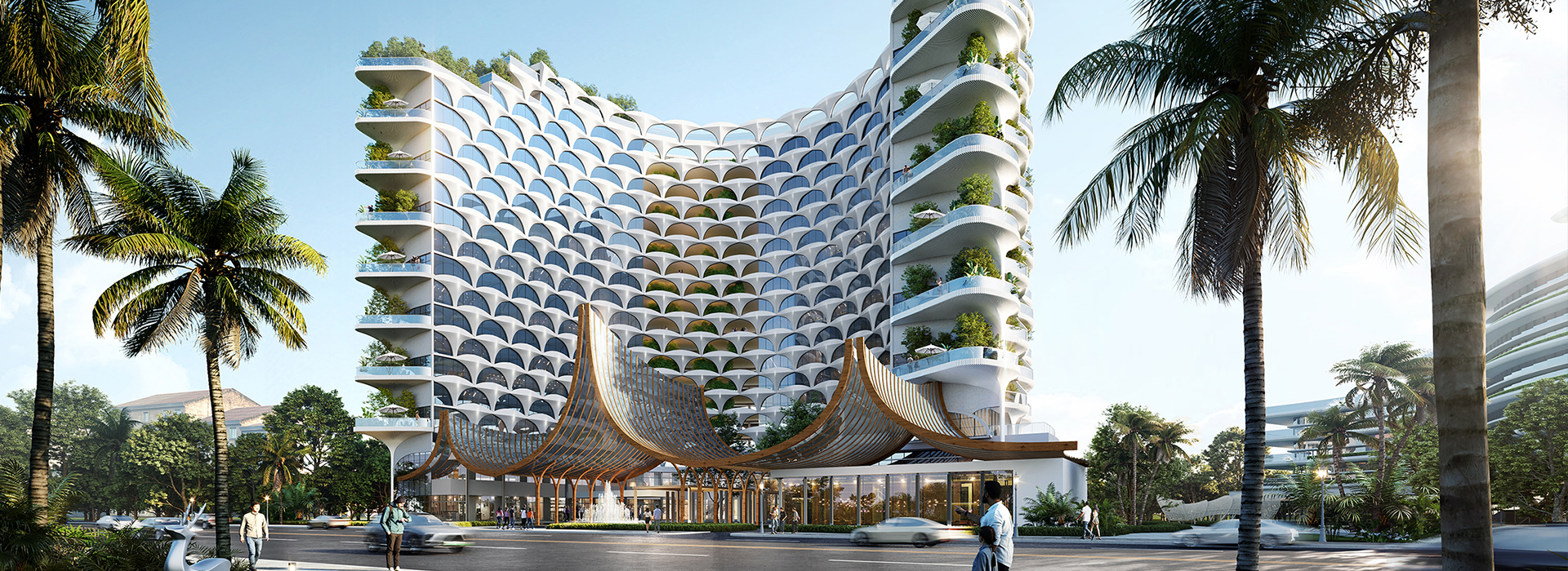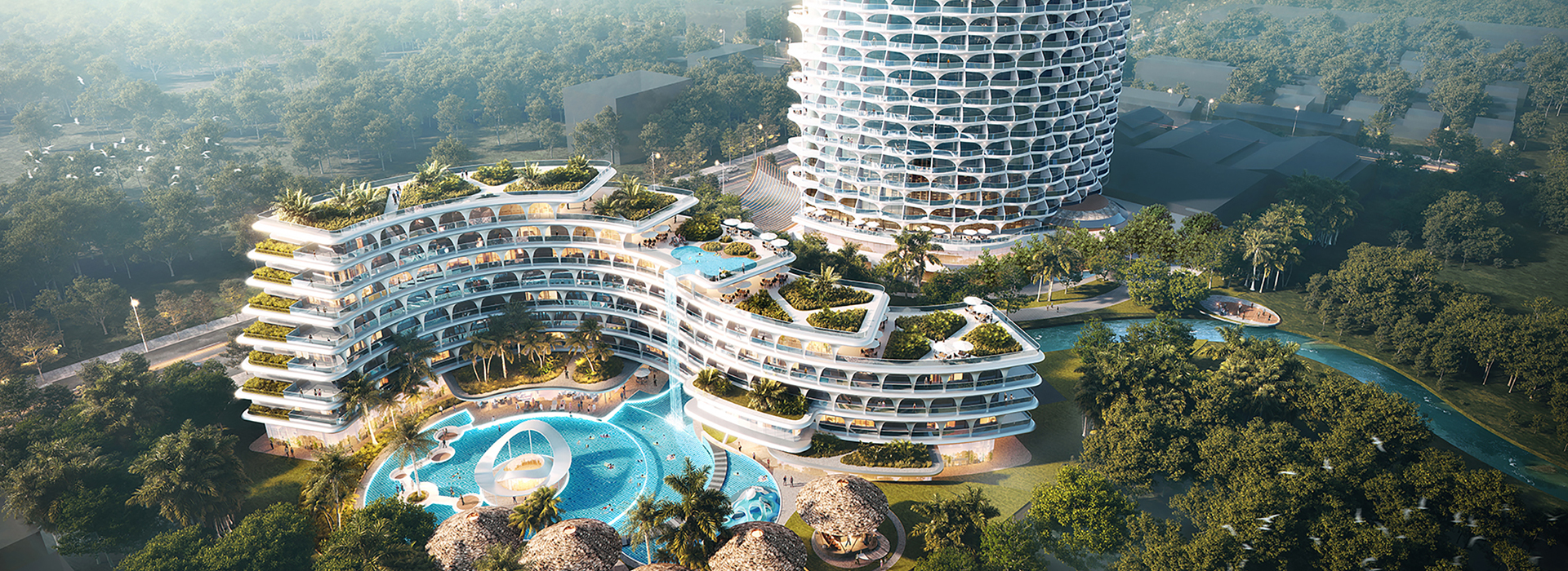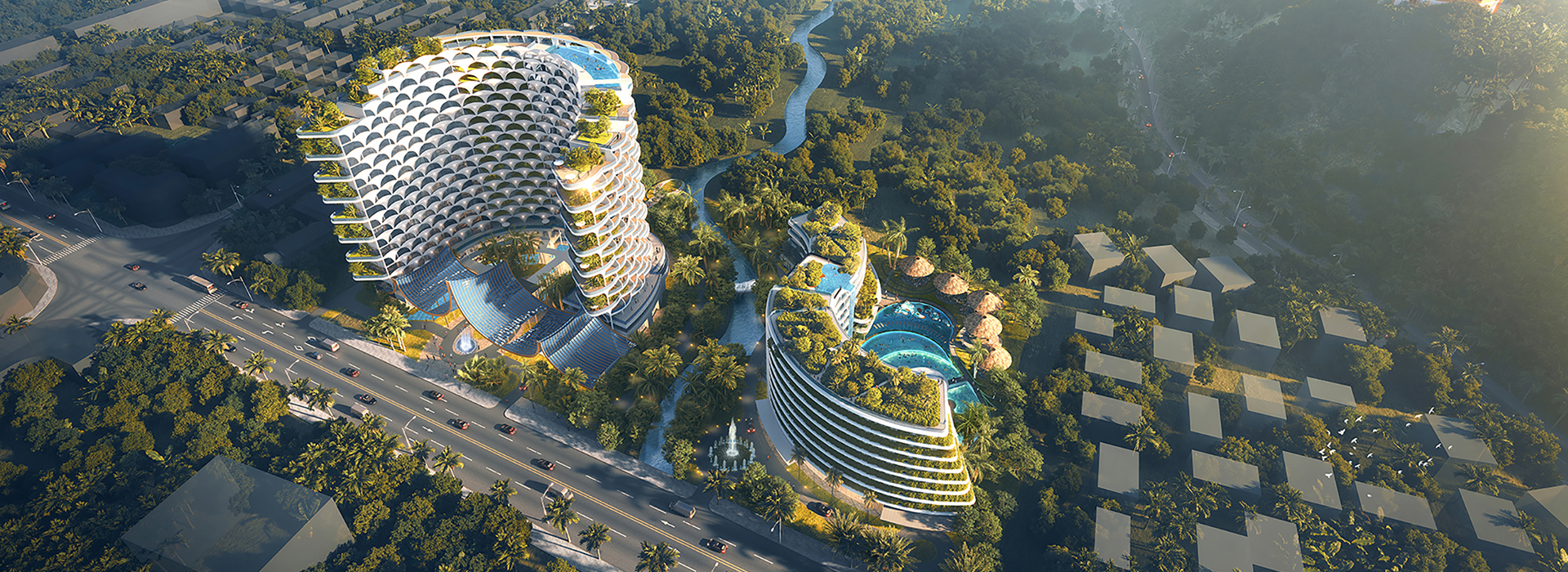 项目北地块为洲际五星级假日酒店,南地块为高端精品英迪格酒店,总建筑面积约6.5万平方米。项目建成后,将成为芒市的点睛之笔,显著提高孔雀湖旅游度假区游客居住环境,进一步夯实芒市国家优秀旅游城市根基。设计灵感源于孔雀,将其气质之美与建筑完美融合,同时融入孔雀舞的精髓、历史传说的神秘感以及细腻高雅的造型艺术,打造独具特征的度假产品。