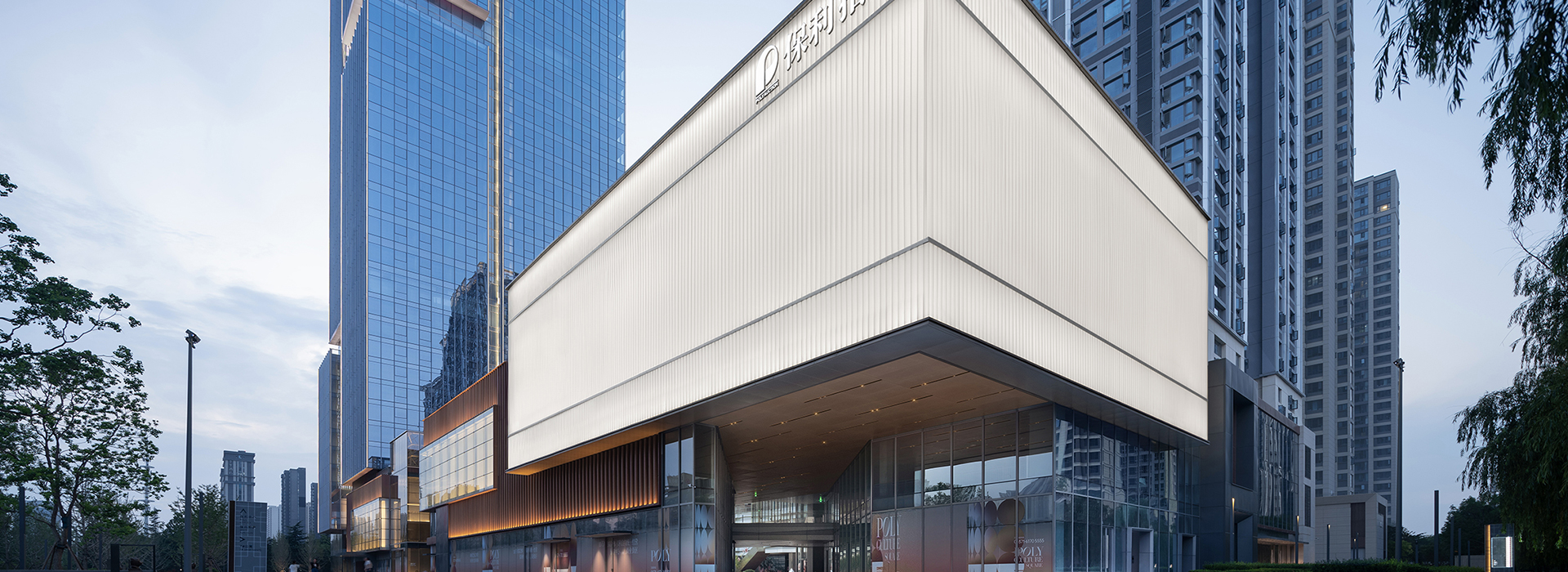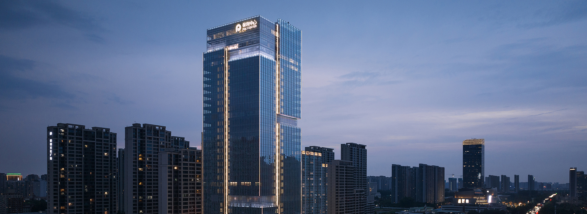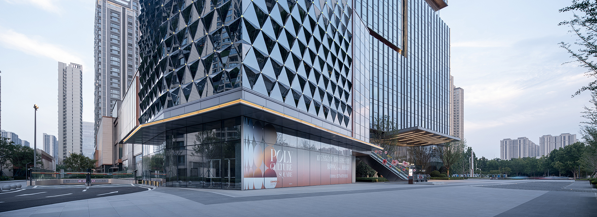 项目从郑州城市文化中汲取灵感,将后母戊鼎的精致纹理提炼升华,转化为一种龙腾九霄、奋发向上的建筑语言。幕墙系统整体采用了单元式幕墙。塔楼幕墙整体分为灰蓝色和白色玻璃两种材质,通过竖明横隐的玻璃杆件以及角部特殊造型杆件,进一步强化了体块之间的层次感和立体感。形体内嵌的“龙腾”肌理采用白色玻璃,与外围的灰蓝色玻璃体块形成鲜明对比。这种色差与线条变化的结合,巧妙地拉开了空间层次,增强了造型的视觉效果。