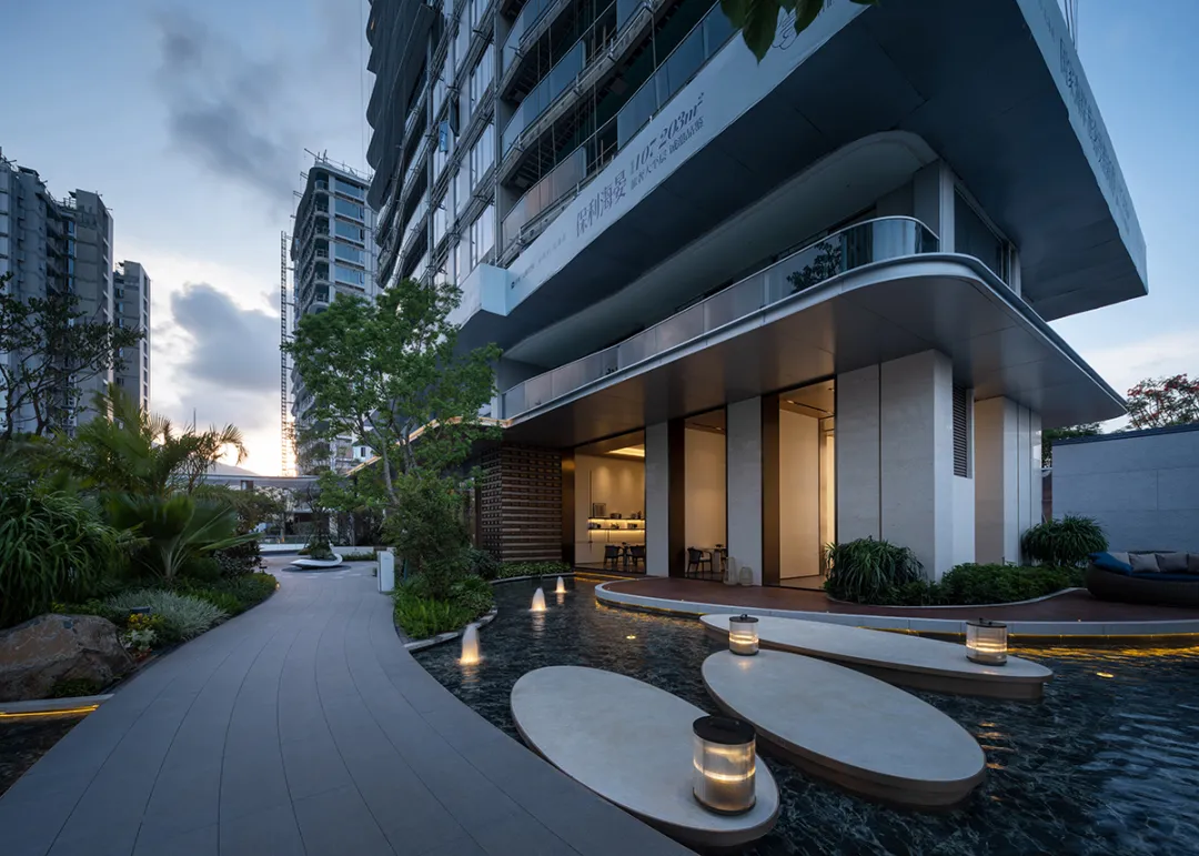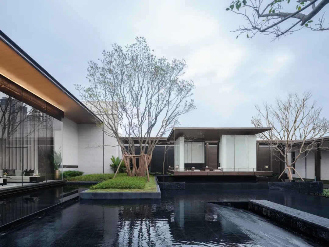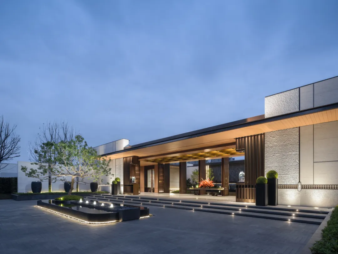 本案为福建首个瑧悦项目,位于莆田市荔城区,传达出中国文人隐逸山水的理想。项目地被高大荔枝树林环绕,营造出“世外桃源”的感觉,南侧市政公园地形起伏,又有河道穿过,颇有场景想象空间。整体设计以市政路为前区引导空间,将市政公园纳入展示区打造范围,通过多感官视角,模拟自然形态,营造舒适的“园”空间意向。项目打造东方意韵美学的归家四重境——蓝楹夹道、礼序前院、门堂中庭、山水隐园四大景观场景和门堂、轩堂、厅堂三大礼仪节点,通过光影回廊将其串联,在一步一景间将当代东方的意韵与礼序徐徐呈现。