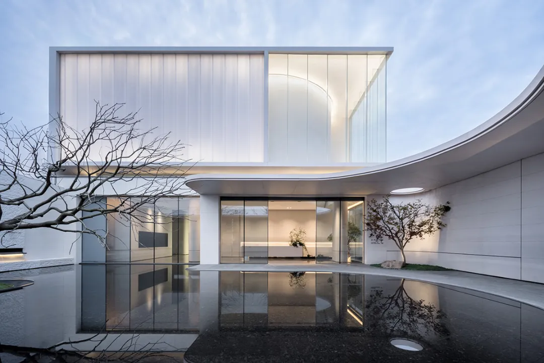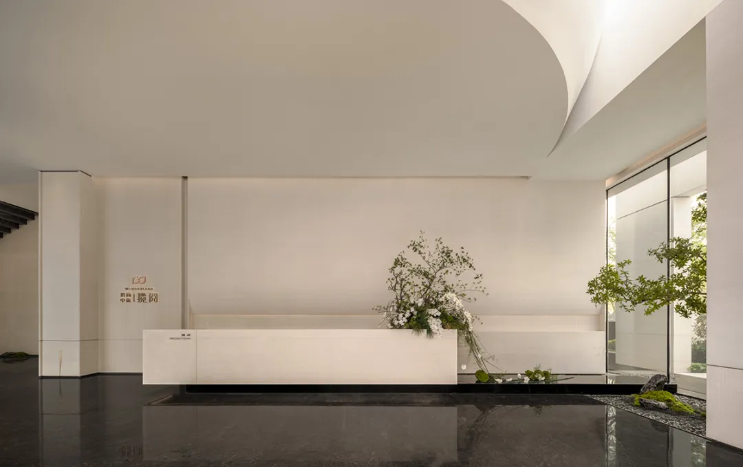 售楼处室内设计以“无界”为概念灵感,打造一个白色基调、穿插自然绿意的艺术馆,旨在创造生活、艺术与美学的共鸣体验。设计通过大面积的玻璃幕墙将室外景色无缝引入室内,营造出纯净、通透的空间。精选的软装与硬装相互呼应,增添温馨与活力。自然光成为设计的关键元素,营造出戏剧性的光影效果,随时间与季节变化展现不同的动态美感。深灰色巨幅瓷砖地面增强了空间对比与层次感,整体设计让空间在视觉上实现无限延伸,同时营造出宁静而变化的氛围,令人感受到时间流动与自然之美。