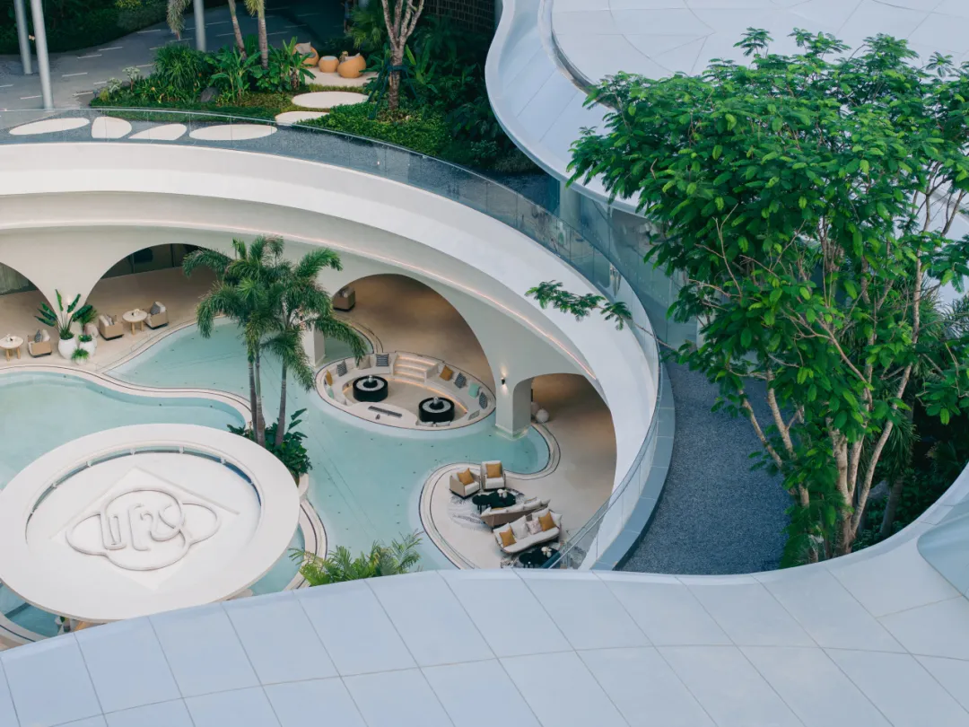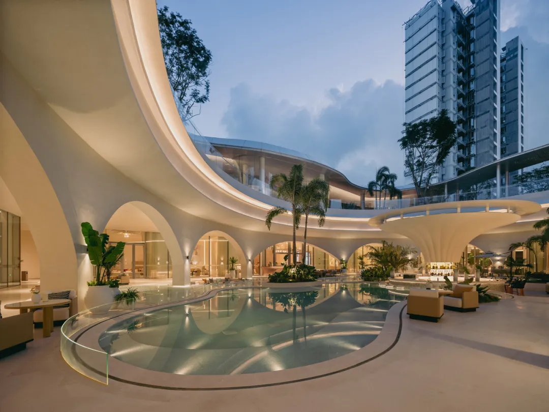 项目位于三亚海棠湾,是国内顶级旅游度假区,设计围绕“什么样的产品能让业主回归真正的度假”展开。占地57885㎡,容积率仅1.4,限高60米,选择全部高层布局,强调开放空间和公区舒适度,致力于提供真实的度假体验。建筑密度低于10%,设置3000㎡的下沉会所和宽敞楼间距,底层架空连接,打破空间与景观的边界,营造社交花园。大门设计流畅曲线,营造松弛感;会所采用白色曲线拱券,与泳池相映,带来宁静氛围。住宅立面延续曲线元素,270°全景阳台使住户在家即可享受三亚的自然美景,回归度假的本质。