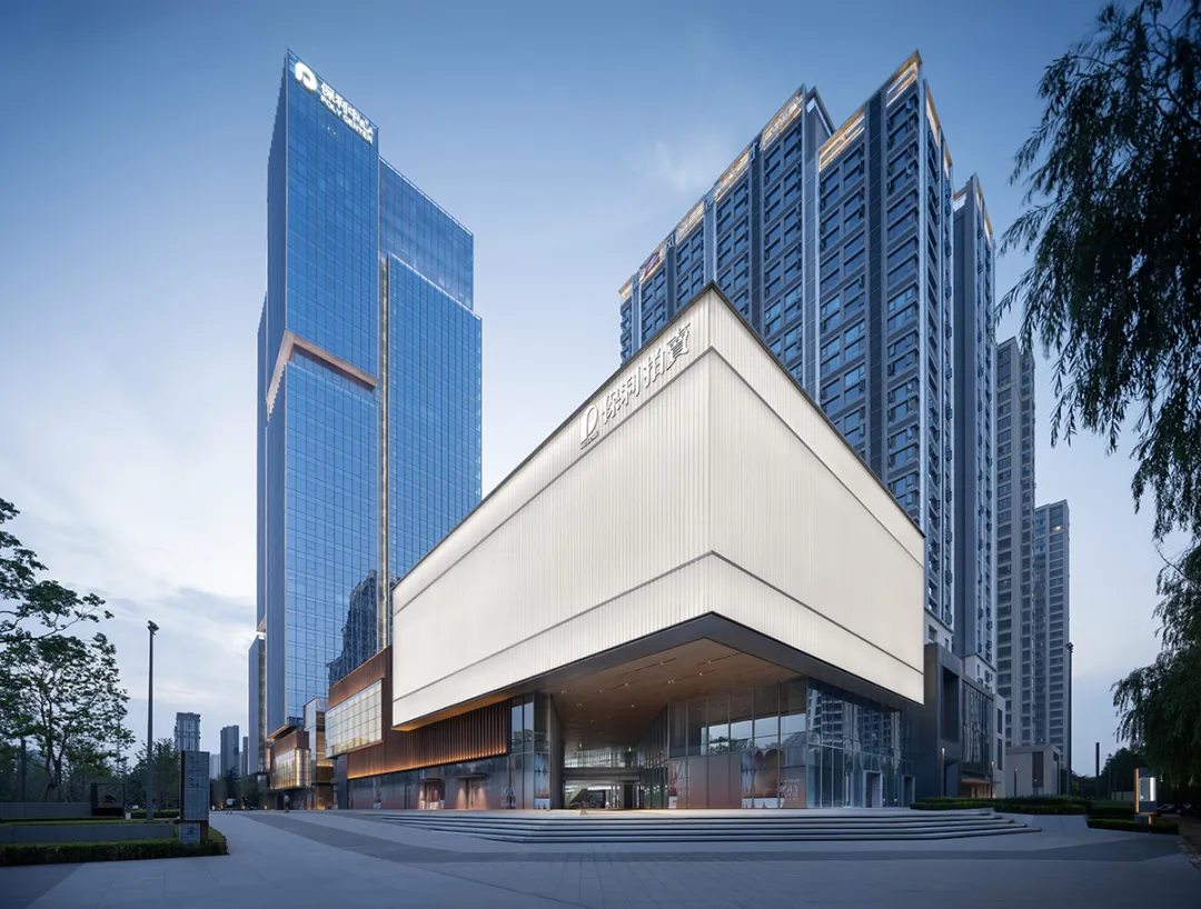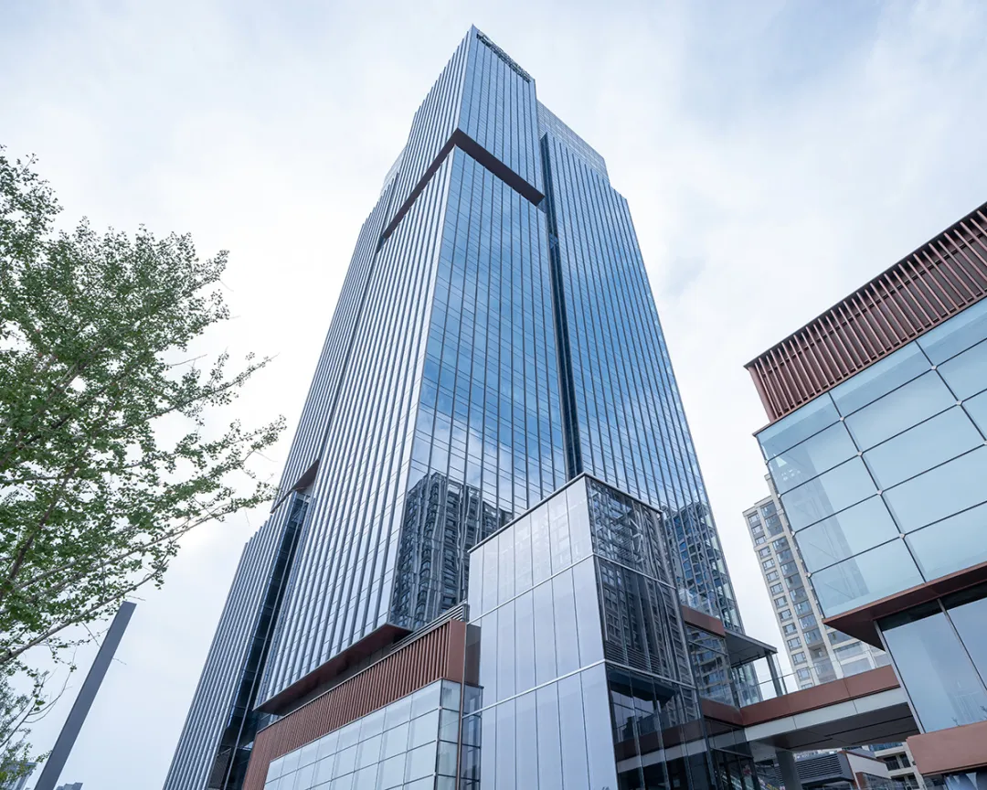 保利中心位于科学大道与雪松路的黄金交汇点,150米高的塔楼重塑了郑州的城市天际线。项目从郑州文化汲取灵感,将后母戊鼎的精致纹理转化为龙腾九霄的建筑语言,契合河南的悠久历史与保利企业“追求卓越”的文化。塔楼幕墙整体分为灰蓝色和白色玻璃两种材质,通过竖明横隐的玻璃杆件以及角部特殊造型杆件,进一步强化了体块之间的层次感和立体感。形体内嵌的“龙腾”肌理采用白色玻璃,与外围的灰蓝色玻璃体块形成鲜明对比。这种色差与线条变化的结合,巧妙地拉开了空间层次,增强了造型的视觉效果。