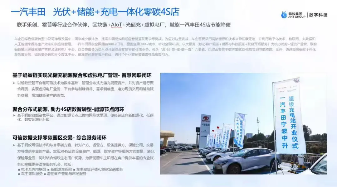 蚂蚁数科新能源和可信产业事业部副总经理丁光敏带来《四轮车充换电全链数智化解决方案:综合能源网络与价值升维》精彩演讲,具体阐述蚂蚁数科聚焦技术服务与科技金融领域,围绕新能源行业实物资产,构建起可信、可管、可交易的全链数字化服务体系,并与支付宝携手打造全流程服务闭环。他还提到,蚂蚁数科携手霍普股份等行业伙伴,与一汽丰田合作推进光储充 4S 店项目,基于蚂蚁链实现光储充能源聚合与虚拟电厂管理,助力一汽丰田 4S 店节能降碳,推动产业绿色发展。